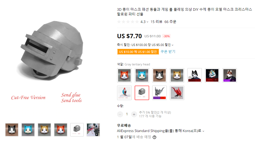 고양이가면을 클릭해보니 다른 가면들도 많이 있더라구요! 거기에 배틀그라운드 헬멧 종이가면은 7.7달라!
