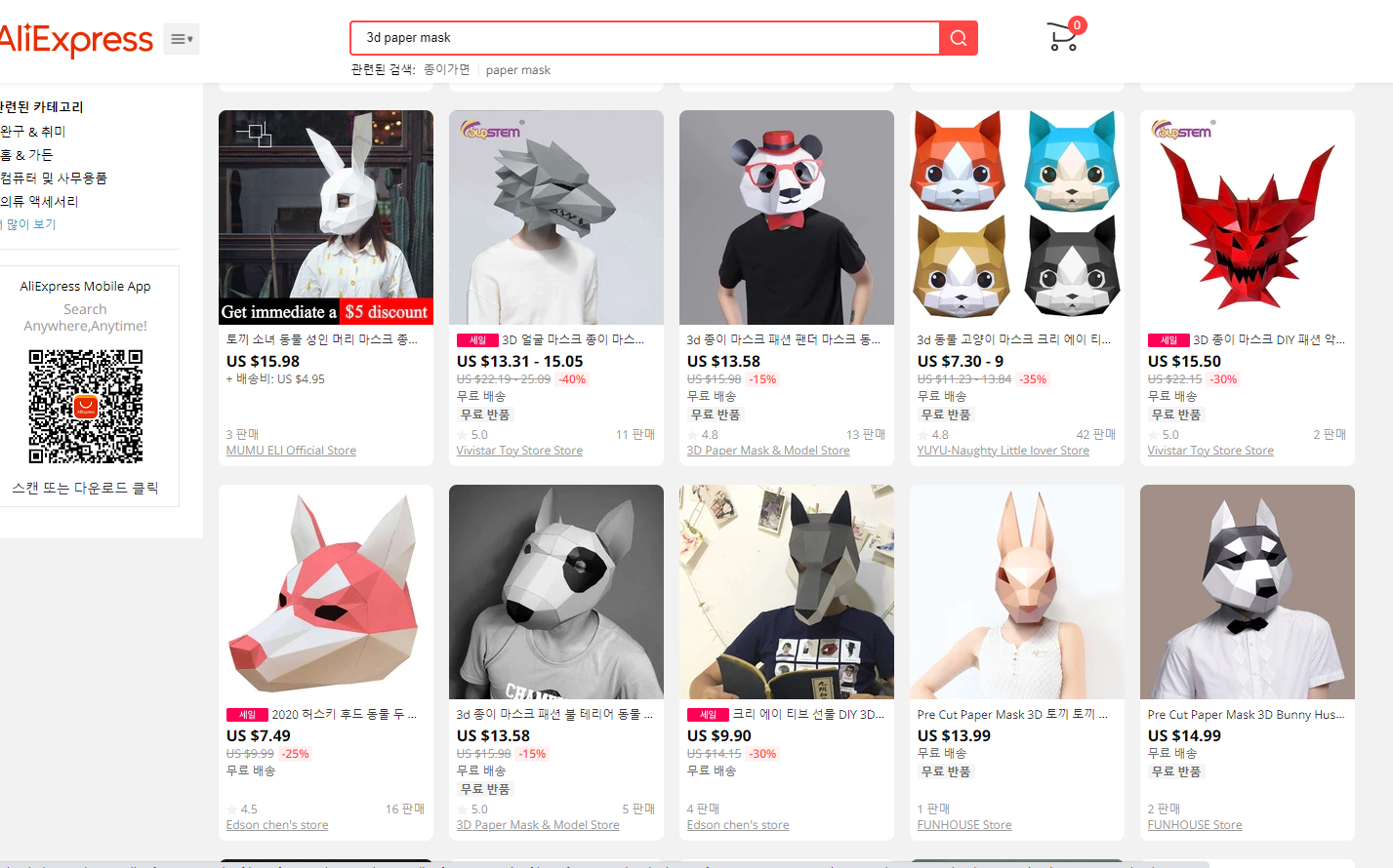 알리익스프레스에서 '3d paper mask'라고 검색하시면 짜잔 이렇게 많은 3D 종이가면을 볼 수 있습니다.
