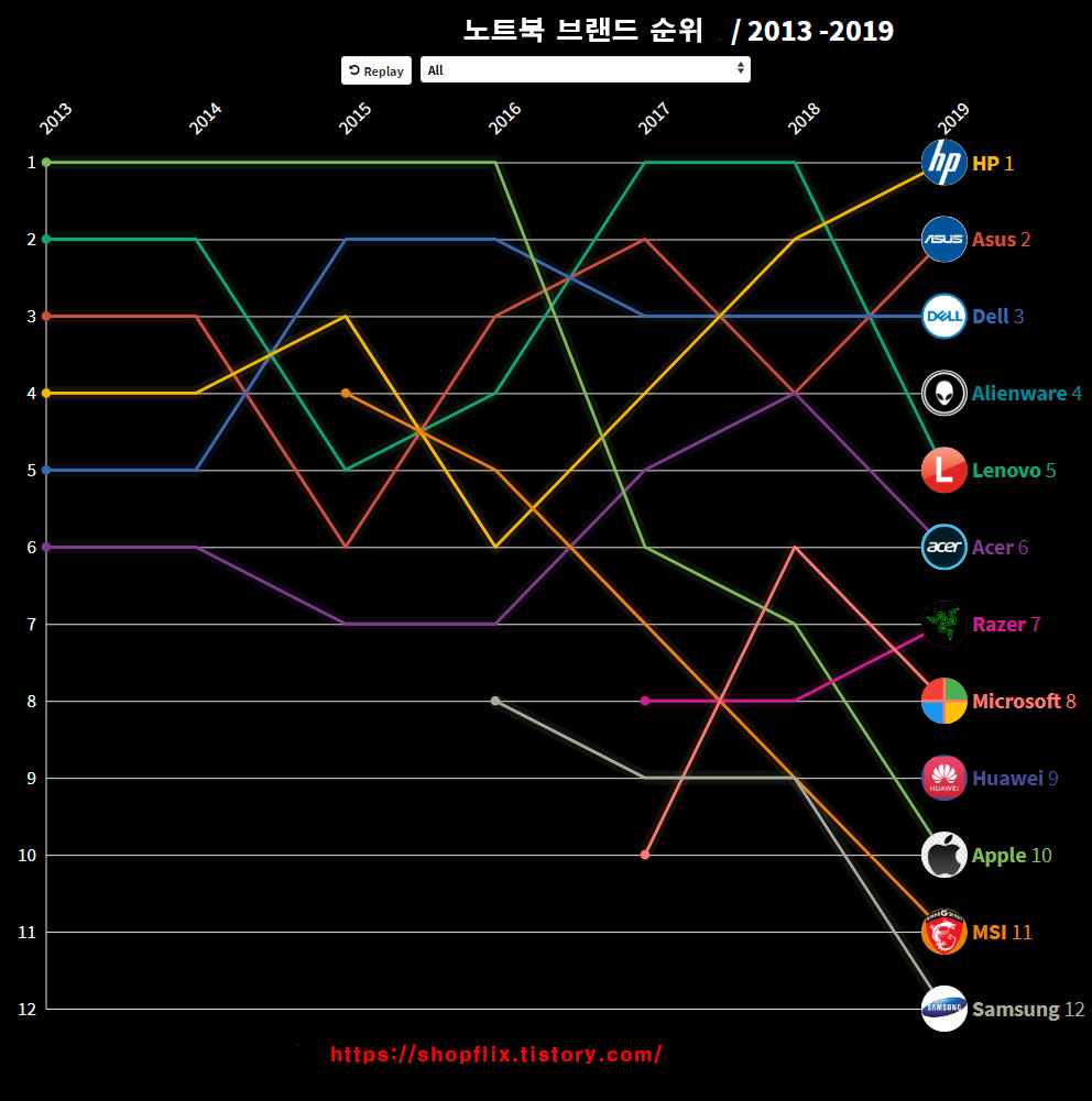 다음으로 2013 년부터 2019 년 까지 최고의 노트북 브랜드 가 된 것을 인터랙티브 그래픽 으로 보여줄 것입니다. 그것을 만들 때 최근 몇 년 동안 일어난 큰 변화를 깨달았습니다.