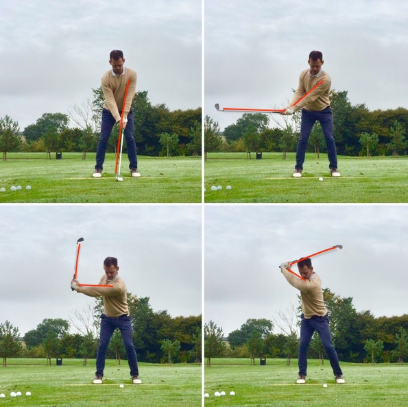 클럽이 반쯤 뒤로 골프공을 가리키면 백스윙이 잘 되고 있습니다. 우리는 이것을 'on plane'라고 부릅니다(아래 왼쪽 하단 이미지 참조).