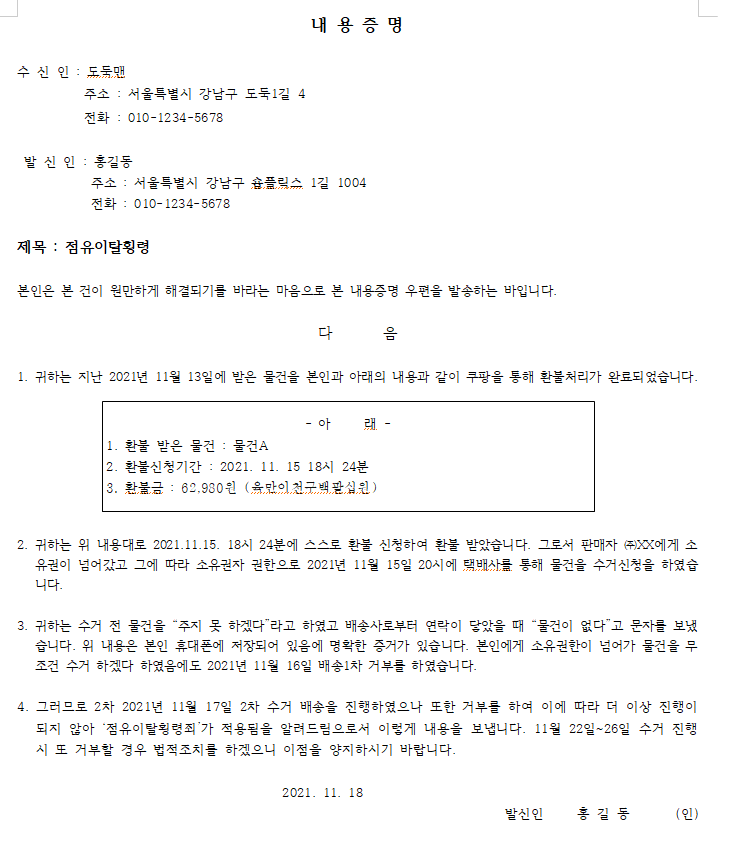 귀하는 위 내용대로 2021.11.15. 18시 24분에 스스로 환불 신청하여 환불 받았습니다. 그로서 판매자 ㈜XX에게 소유권이 넘어갔고 그에 따라 소유권자 권한으로 2021년 11월 15일 20시에 택배사를 통해 물건을 수거신청을 하였습니다.