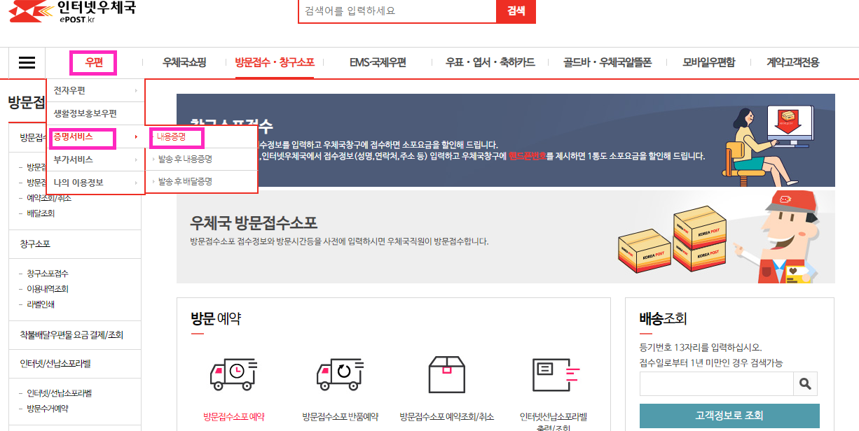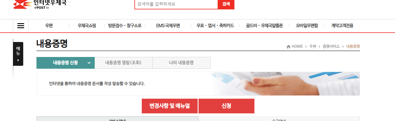 우체국 홈페이지에 접속후 메인화면에서 우편- 증명서비스 - 내용증명을 클릭해주세요