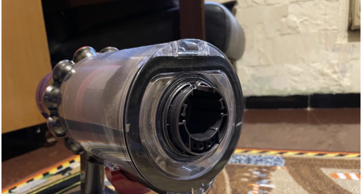 다이슨 V11 앱솔루트 프로의 뒷면은 필터로, 흡입된 공기를 미세한 먼지와 먼지 입자로 청소한 후 작은 구멍을 통해 뒷면으로 배출합니다. 필터는 가끔 수돗물로 헹구면 분리 및 청소가 가능하며, 진공청소기를 많이 사용하는 경우 6개월에 한 번씩 필터를 교체할 것을 다이슨에서 권장하고 있습니다.