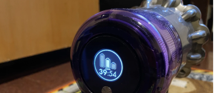 V11 Absolute Pro가 실행 중일 때 화면에는 현재 배터리 수준에서 진공 청소기가 작동할 예상 시간이 표시되며, 이는 사용하면서 자연스럽게 카운트다운됩니다. 이것은 또한 진공 청소기에 연결된 부속품에 따라 달라집니다. 일부는 진공 청소기 자체에서 전원을 끌어오는 움직이는 부품이 있기 때문입니다.