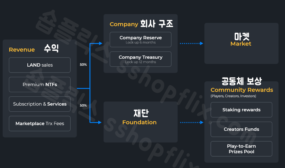 LAND 판매, 프리미엄 NFT 판매, 거래 수수료 및 구독 서비스에서 수집된 전체 SAND 거래량의 50%가 재단에 전달됩니다.