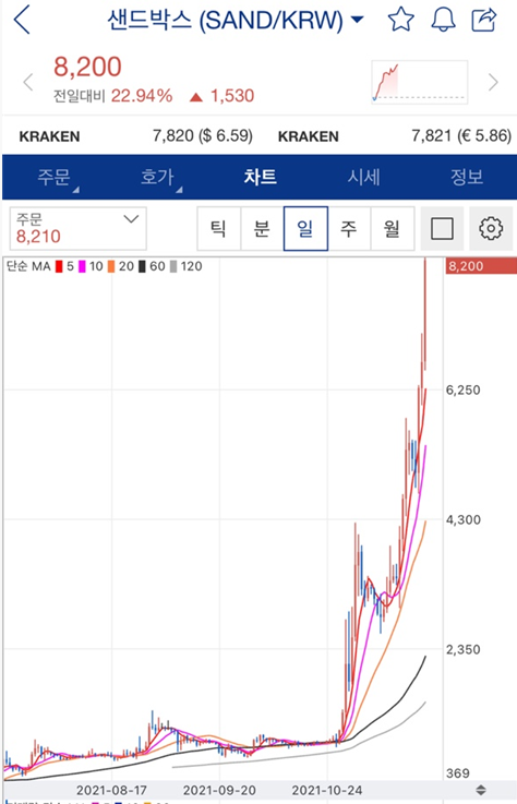 현재 샌브박스 코인 시세는 8200원으올 전일대비 1500원대 상승중에 있습니다.