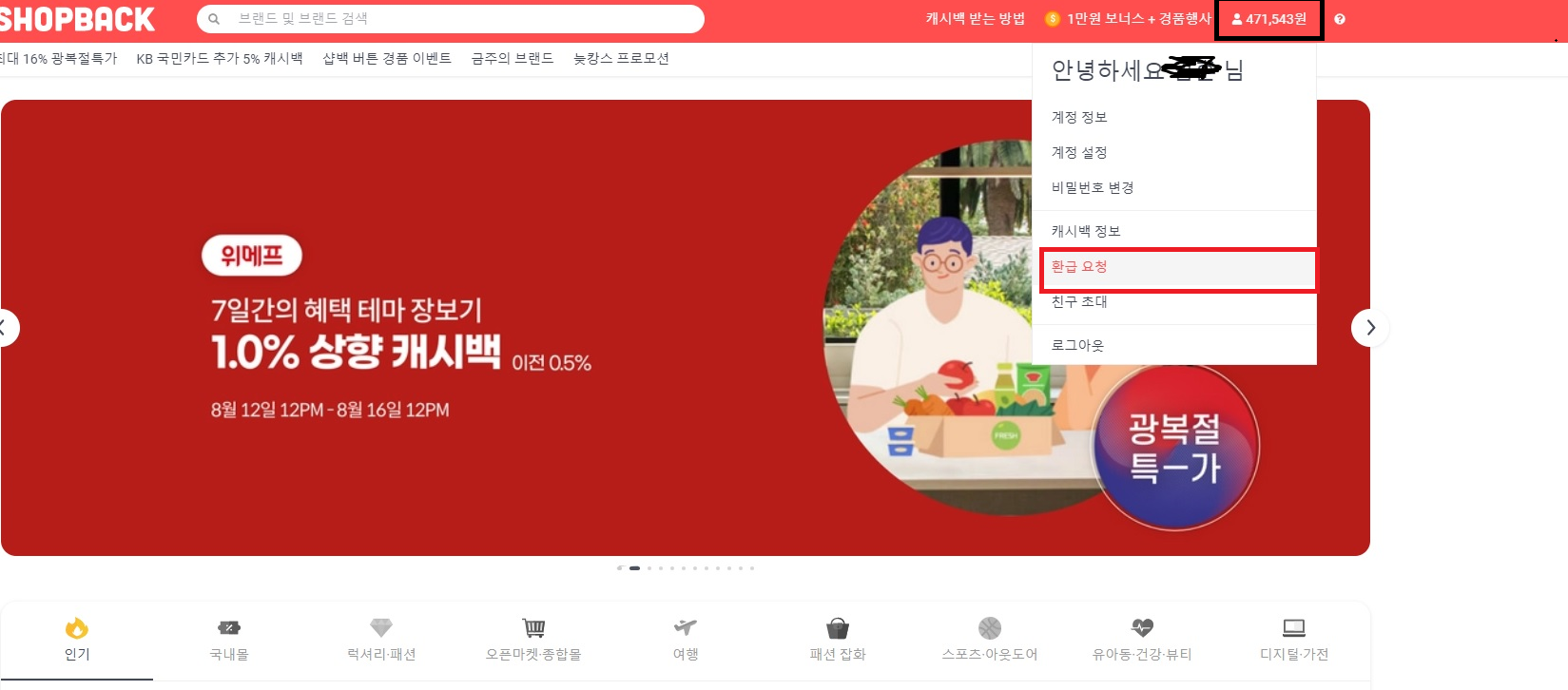 샵백 캐시백 환급 받는 방법 첫번째 단계 환급요청하기