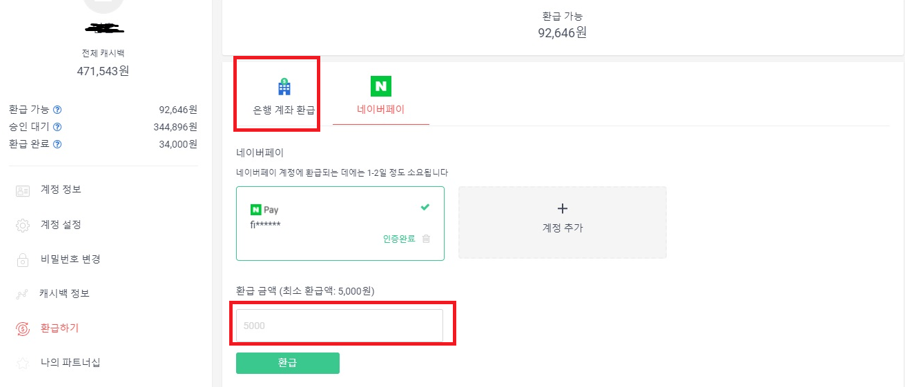 저는 네이버페이와 연동해서 네이버머니로 받지만 현금으로 받고 싶은 분은 은행 계좌 환급을 클릭!