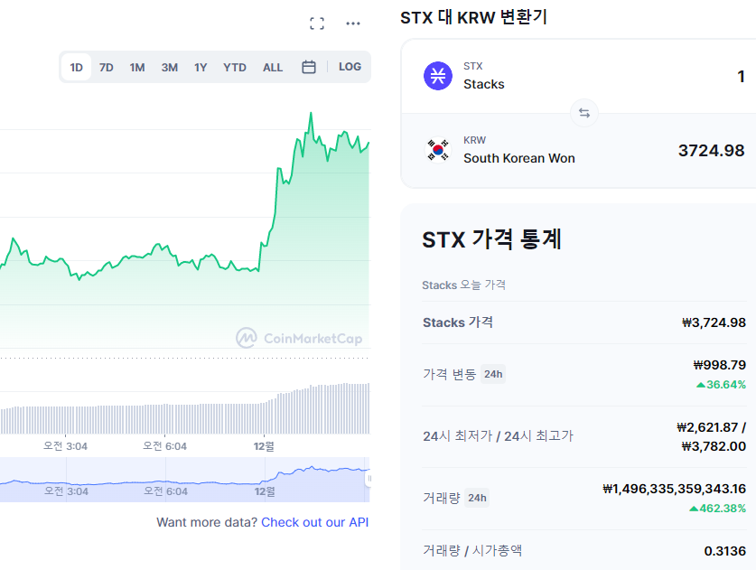 12월01일 현재 스택스 코인은 급등하고 있습니다.