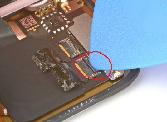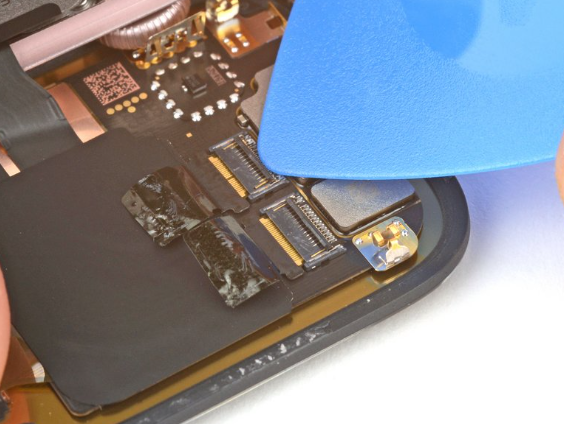 핀센을 사용하여 두 개의 스크린 케이블 ZIF 커넥터를 덮고 있는 테이프를 벗깁니다.