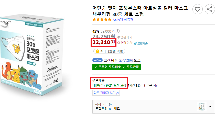 일반 로켓배송으로 포켓몬 마스크 주문하면 24,250원 이지만 저는 와우 회원이여서 22,310원에 구매했습니다.