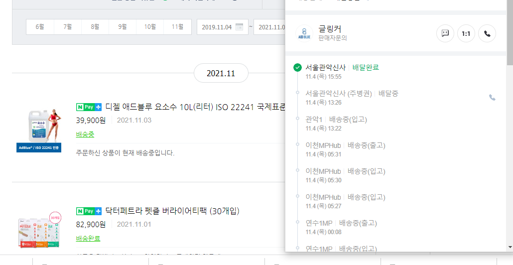 요소수 판매점 온라인에서 글링커라는 네이버 스토어에 EMS 특송 배송