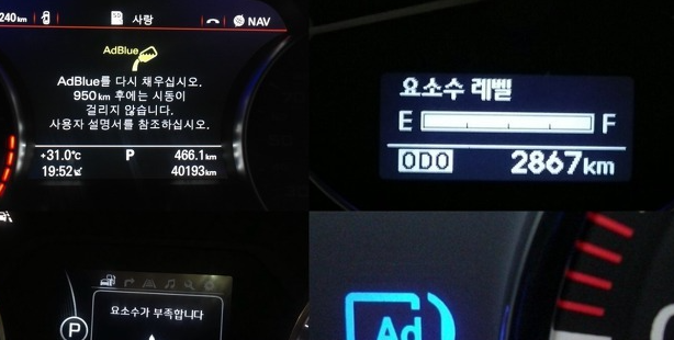 요소수 부족 계기등 점멸뒤 주행 거리 : 2400km