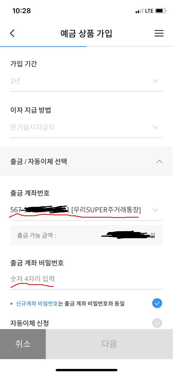 ⑨ 상품 가입정보 및 금액 기입하기 중간 화면에 '출금계좌번호' 선택 후 '비밀번호' 입력 후 '다음'을 눌러 주세요