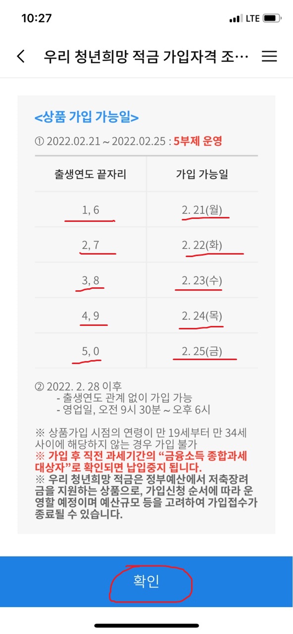 ⑥ 우리은행 청년희망 적금 가입 가능일 화면을 읽어보시고 아래 하단 '확인'을 클릭