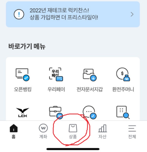 ② 우리WON뱅킹앱을 열어 하단에 있는 '상품'을 클릭! 합니다.