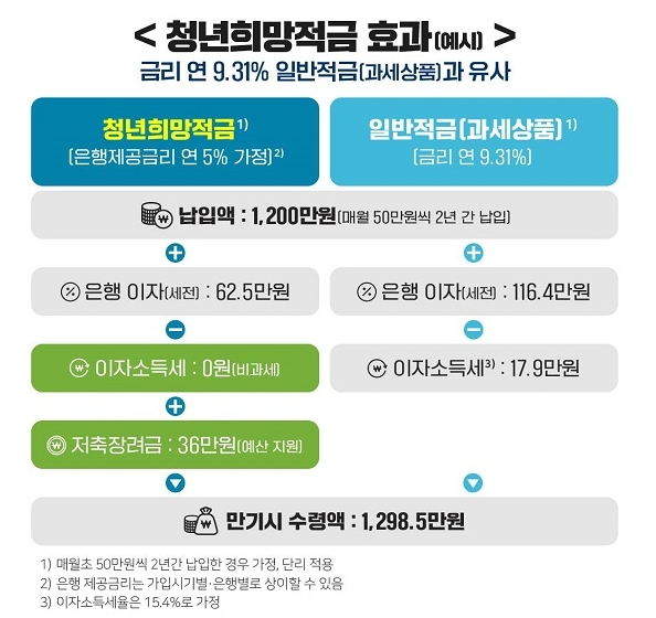 그 이유는 청년희망적금의 경우 소득세의 과세를 하지 않는 비과세로 들어가 9.31% 적금 이윤과 비슷하죠.