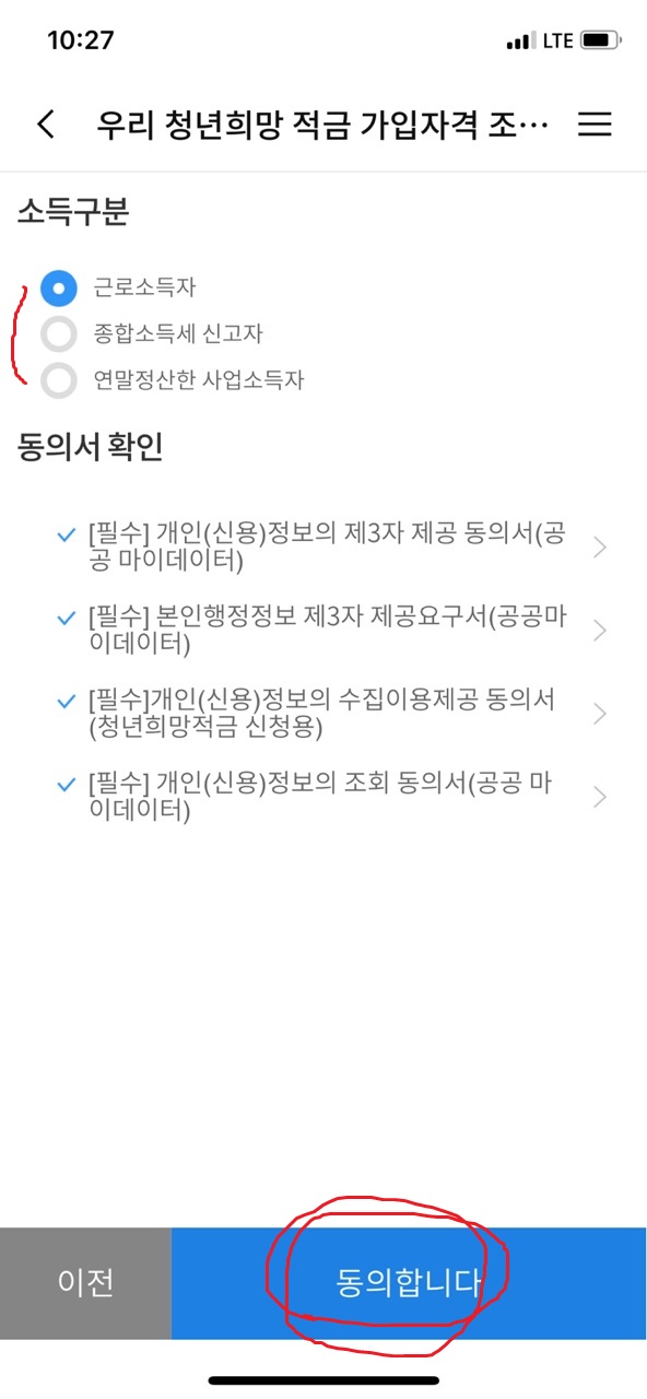 ⑤ 우리은행 청년희망 적금 가입자격 조건 화면이 나오는데 자신에게 맞는 소득구분 조건을 선택해주세요