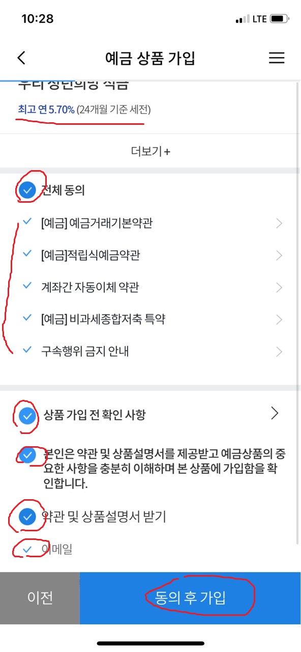 ⑦ 예금 상품 가입화면에 있는 v 체크를 모두 해주세요!