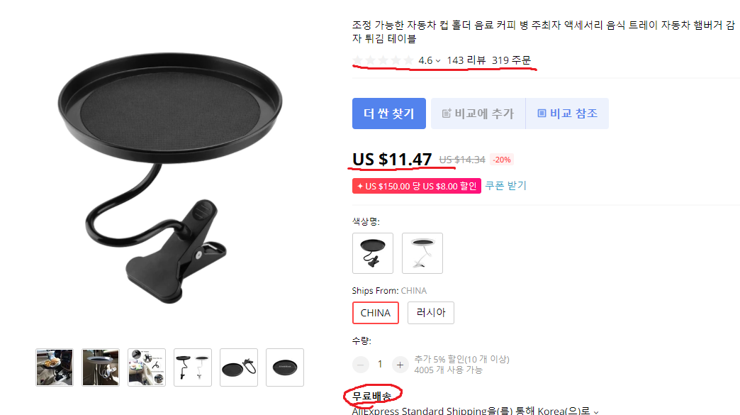 가격 11.47 달러 약 1만 2000원! 거기에 무료배송! 평점도 무려 4.6정도 된답니다 이정도면 상당히 괜찮죠 ㅎㅎ