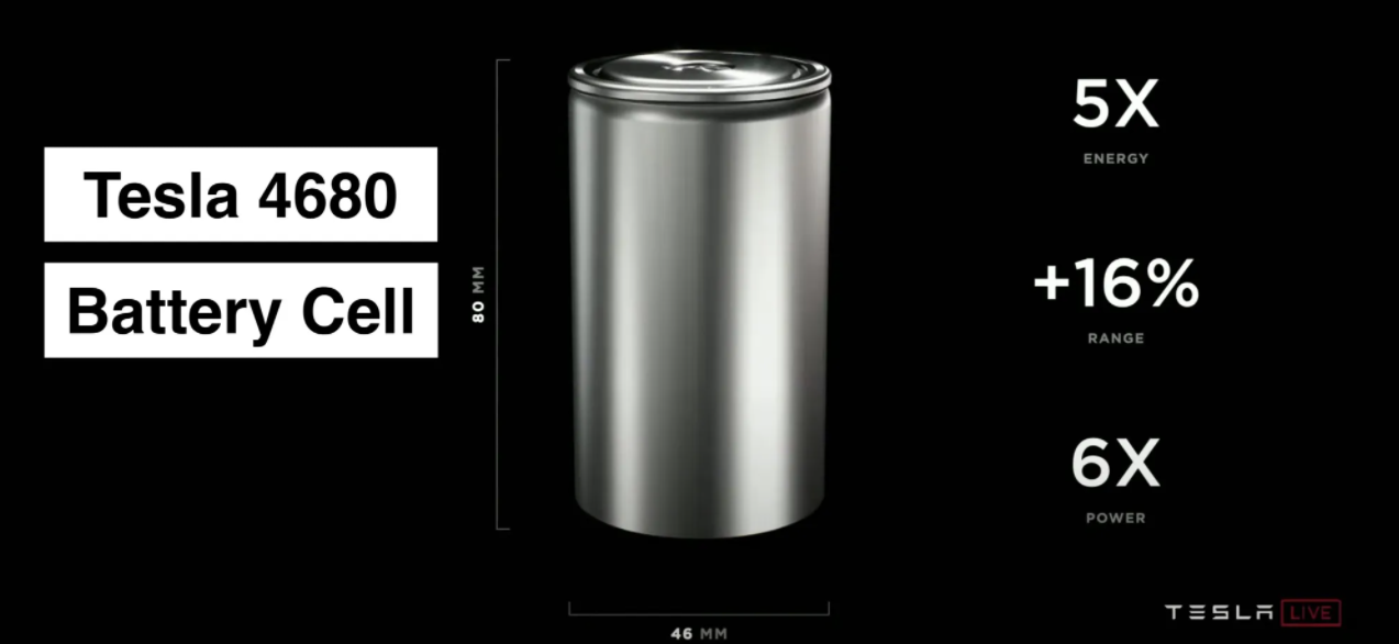 2020년 Tesla는 비용을 크게 절감하면서 6배의 전력과 5배의 에너지 용량을 주장한 훨씬 더 큰 형식의 새로운 테이블 원통형 셀인 새로운 4680 배터리 셀을 공개했습니다 .
