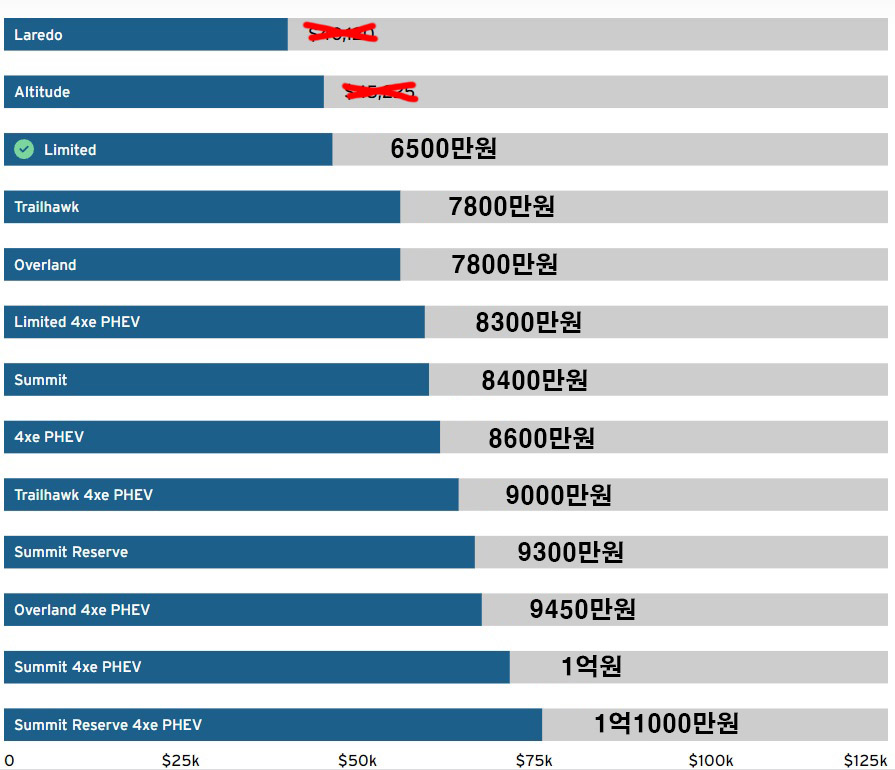 2022년 지프 그랜드 체로키 4xe 하이브리드 트림별 가격은?