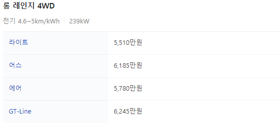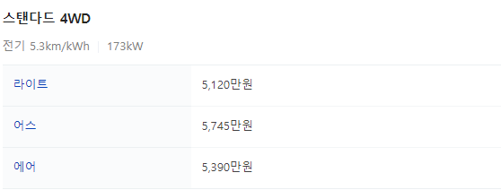 하지만 4륜 듀얼모터인 스탠다드 4WD 라이트 트림이 320마력의 강력한 모터와 보조금 100%를 받을 수 있어서
