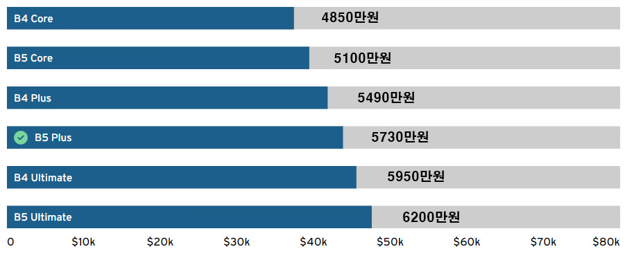 B5는 더 강력한 247마력 엔진을 탑재하고 4륜구동을 제공하기 때문에 가성비트림으로 생각합니다.