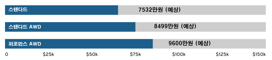 스탠다드 AWD 같은 경우 보조금을 50% 받기위해 8499만원으로 초반에 가격을 맞춰 나올 것으로 예상됩니다.