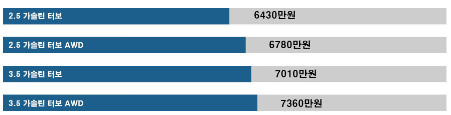 그래도 우리는 표준 4기통보다 약 600만원 더 비싼 트윈 터보 3.5리터 V-6이 제공하는 3.5 가솔린 터보를 추천합니다.