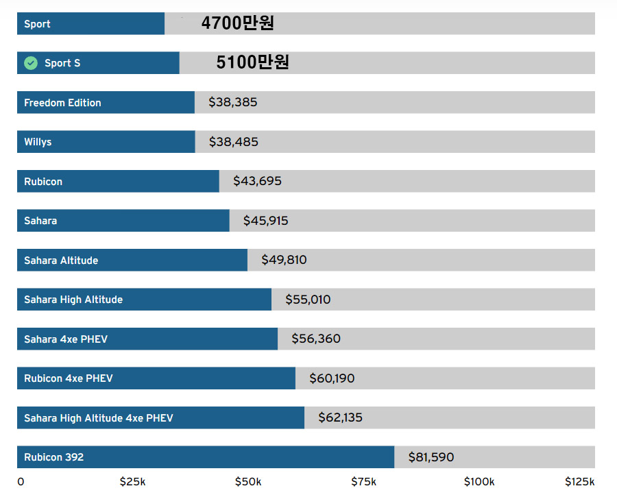 해외나 한국이나 대부분 에어컨, 가죽으로 덮인 스티어링 휠, 파워 윈도우 및 잠금 장치, 자동 헤드램프, 열선내장 등 추가 장비로 랭글러 Sport S를 선택할 것입니다.