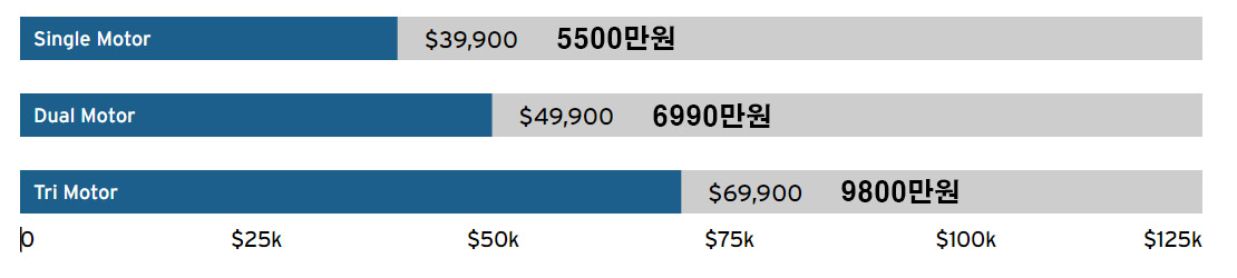단일 모터 버전을 제외한 모든 버전에서 4륜 구동이 기본이지만 모터가 추가될 때마다 더 빠른 가속, 더 긴 주행 범위 및 더 큰 견인 용량을 의미합니다.