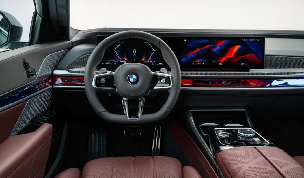 BMW 7시리즈는 인포테인먼트 터치스크린과 동일한 유리 패널 아래에 대형 디지털 게이지 디스플레이가 장착된 BMW iX SUV 와 동일한 대시보드 레이아웃을 사용합니다.