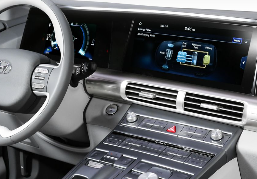 12.3인치 터치스크린 인포테인먼트 인터페이스는 넥쏘의 표준이며 Apple CarPlay 및 Android Auto 통합을 모두 포함합니다.