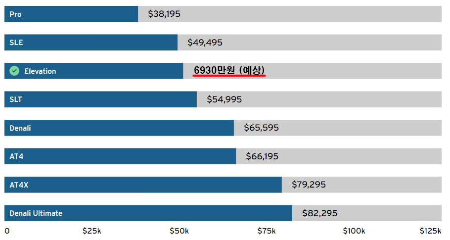 GMC 시에라 1500은 국내 출시 트림은 Elevation트림 정도 확정 될 예정이며 나머지 트림은 출시될지는 정확히 알 수 없습니다.