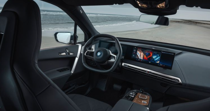 iX의 인테리어 디자인은 대형 곡선형 터치스크린 계기판과 육각형 스티어링 휠을 비롯한 다양한 첨단 요소로 심플하면서도 현대적입니다.