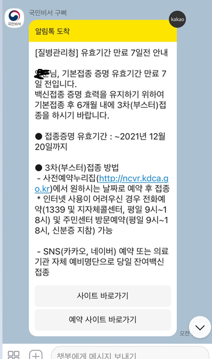 이렇게 카톡으로 도착했습니다. 그러니 7일후 백신패스 만료가 되어 부스터샷 모더나를 접종하지 않으면