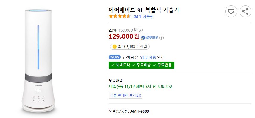 에어메이드 복합식 가습기 같은 경우는 원통형이라 공간도 덜 차지해서 확실히 부모님이 좋아합니다.