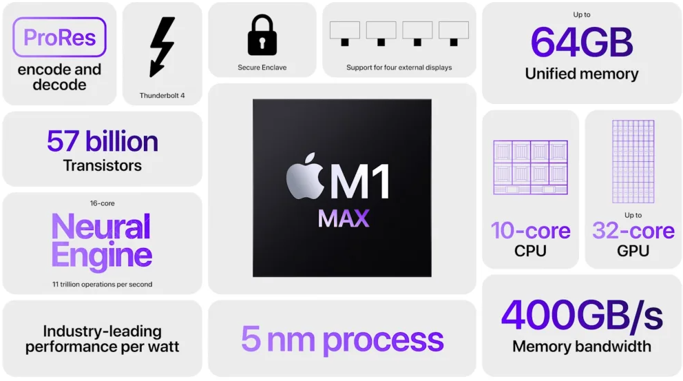 M1 Pro와 M1 Max는 모두 8개의 성능 코어와 2개의 효율성 코어로 구성된 최대 10코어 CPU를 특징으로 합니다.