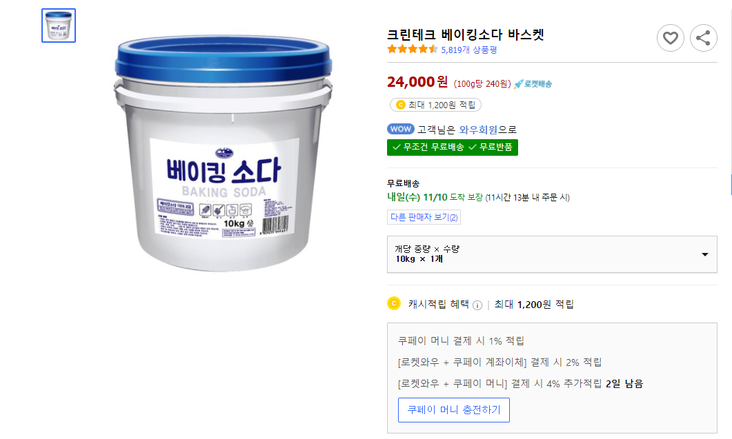 현재 쿠팡에서 베이킹소다 구매가 가능하며 10kg에 2만 4천원에 판매되고 있습니다.