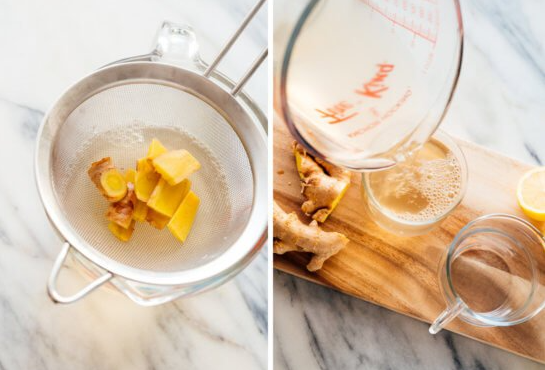 ⑤ 생강을 모두 잡을 수 있도록 가는 체에 차를 붓습니다. 원하는 경우 약간의 보완적인 산도를 위해 레몬이나 오렌지의 얇은 라운드와 함께 차에 넣으십시오. 불타는 생강 향을 완화시켜줄 꿀이나 메이플 시럽을 살짝 뿌려주는 것도 좋습니다.