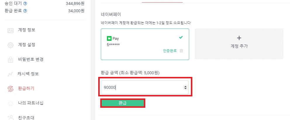 저는 네이버페이와 연동해서 네이버머니로 받지만 현금으로 받고 싶은 분은 은행 계좌 환급을 클릭!