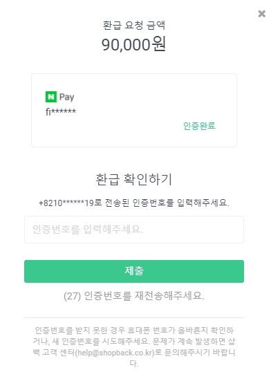 샵백 캐시백 환급 받는 방법 네번째 단계 전화 인증하기