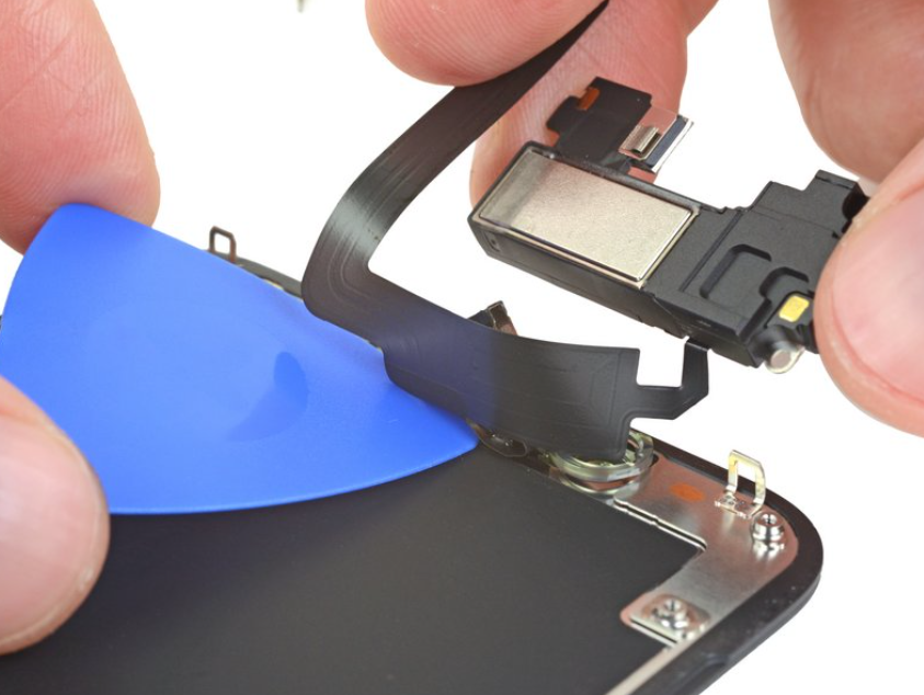 오프닝픽을 플렉스 케이블 및 근접 센서 + 플러드 일루미네이터 모듈 밑을 왼쪽에서 오른쪽으로 밀어주세요.