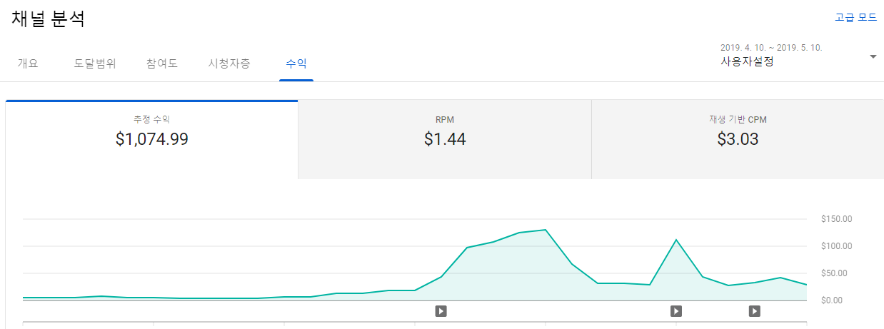 1000달러를 찍히려면 조회수 약 75만에 시청시간 6만 정도되야 한달에 1000달러를 벌 수 있는 것 같네요