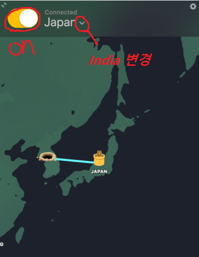 키셔서 로그인후 지역을 India로 변경 후 하얀색 원을 클릭 해서 ON 하면 VPN 작동
