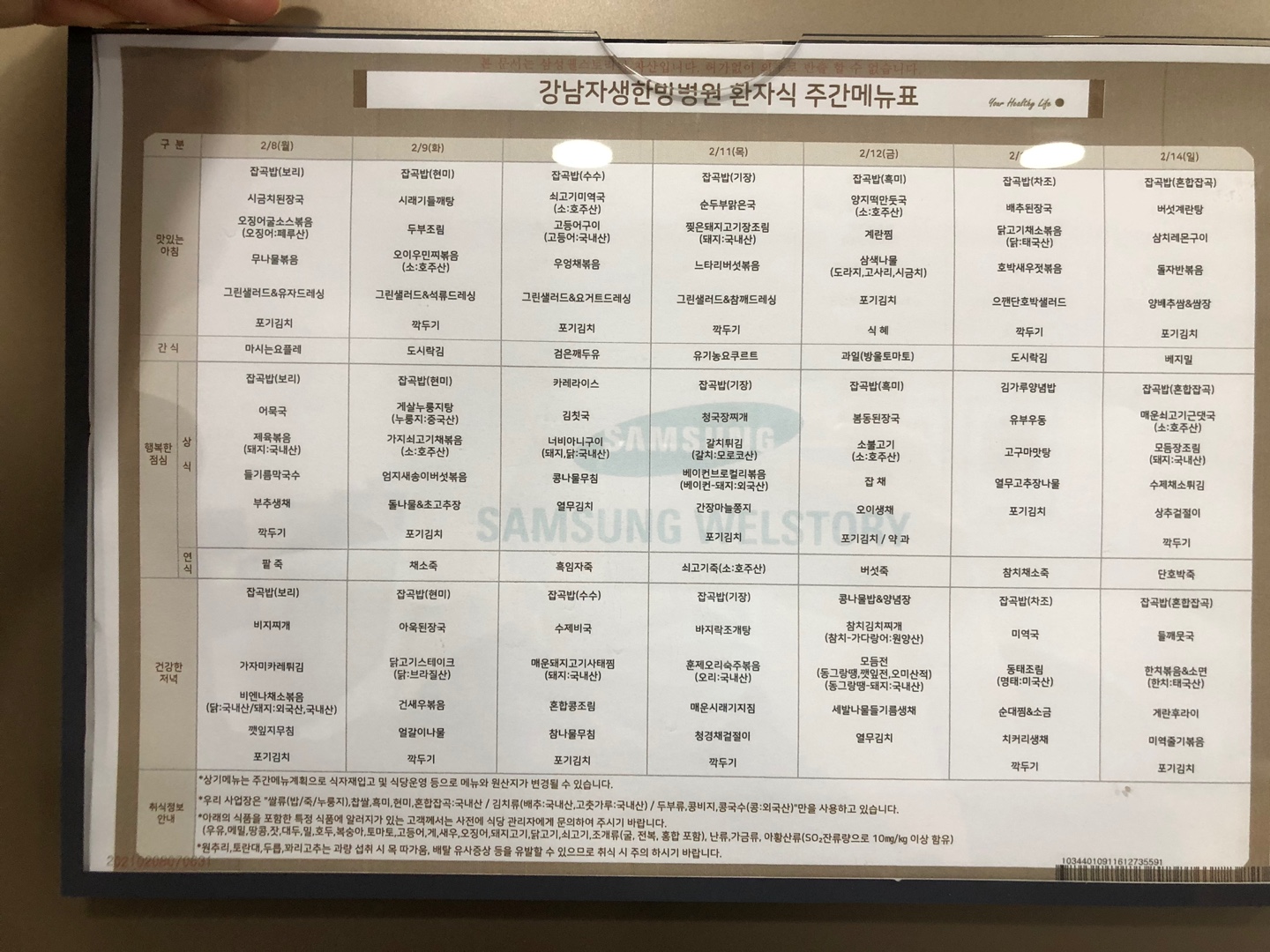 아 강남 자생 한방병원 같은 경우는 휴게실에 식단표가 있어서 미리 확인이 가능합니다.