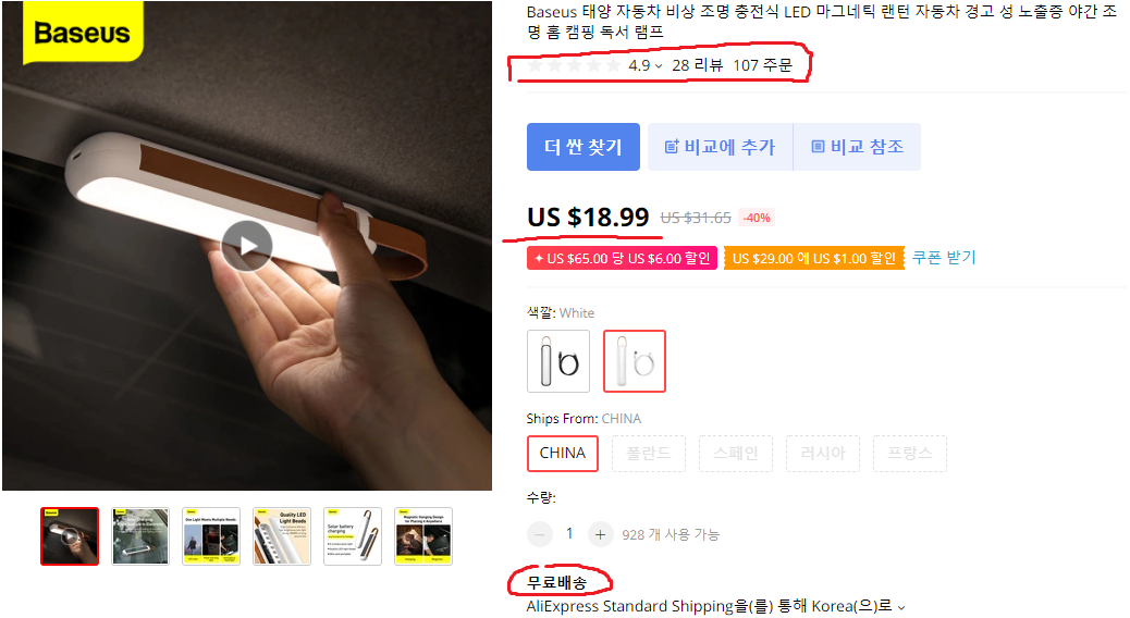 ↓↓알리익스프레스 Baseus 손정등 최저가 (1만8천원) 구매 링크 ↓↓