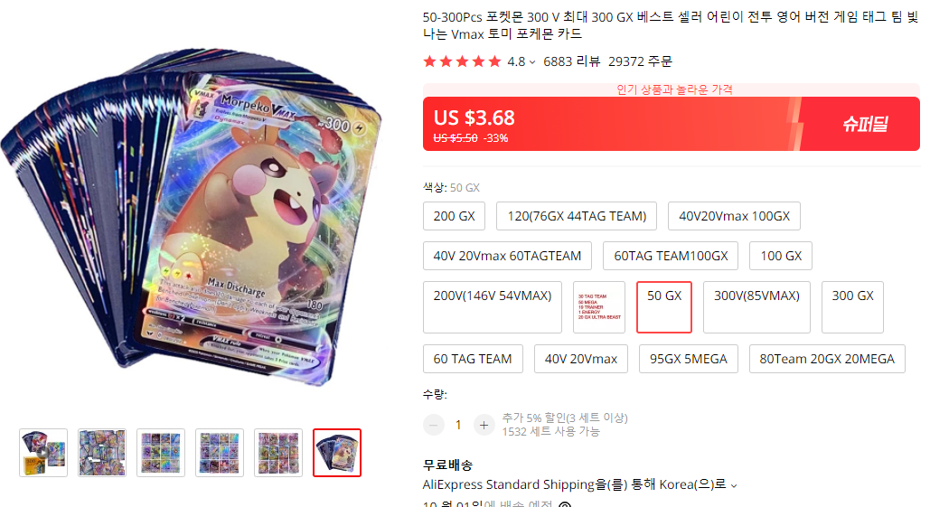 국내에서 똑같은 퀄리티 포켓몬카드를 10배넘게 비싸게 파는데 알리에서 싸게 구매가능합니다.
