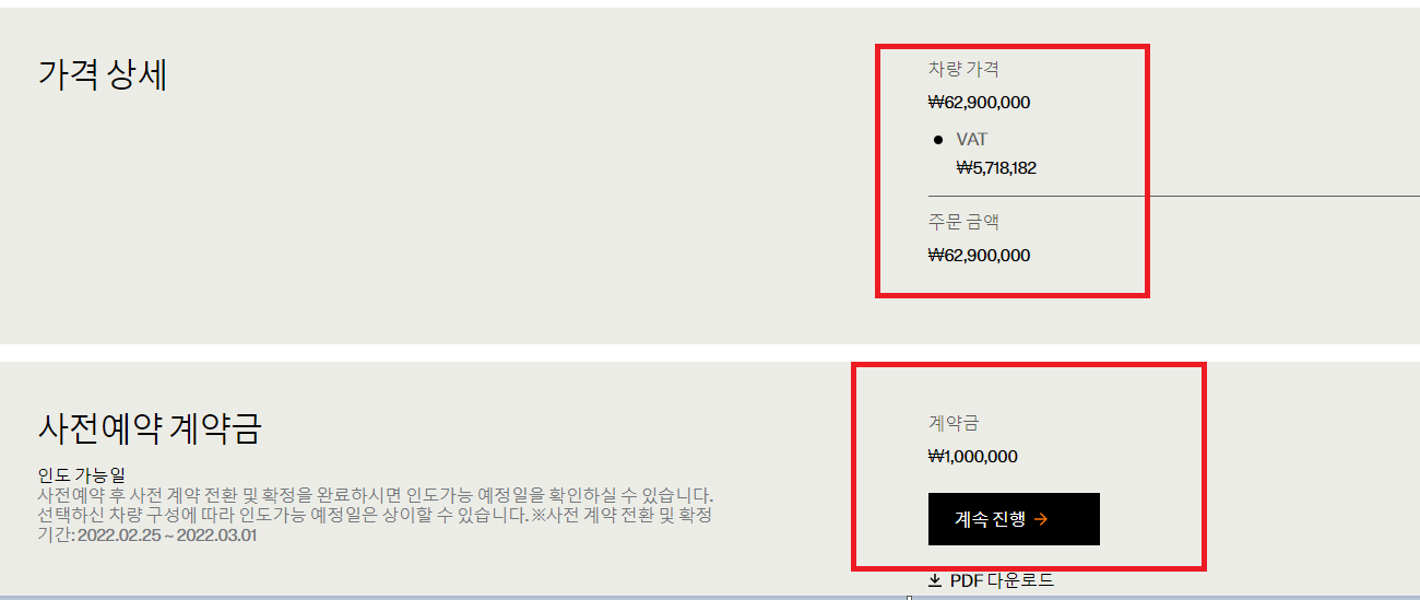 이제 옵션을 모두 선택하고 아래로 가면 차량가격과 계약금이 나옵니다.